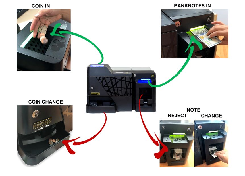 Cashlogy is the new technology to process cash at the Point of Sale. It automates all processes related to cash transactions and simplifies balancing of the register(s). It accepts banknotes and coins and used as a recycler automatically gives exact change.